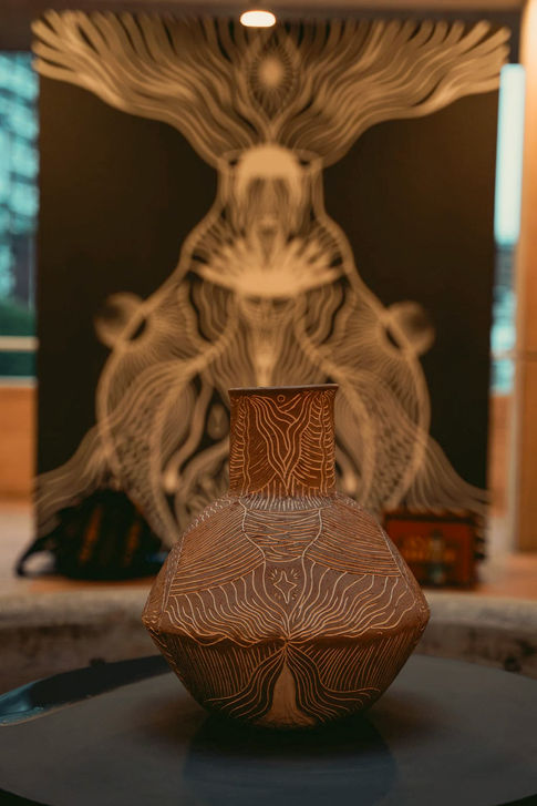 Mi prima Wana regresó a estos altares hechos para nuestras madres y abuelas. Su presencia nos regaló un baño sonoro que nutrió nuestros altares comunes para que el sonido llegara hasta ellas. También les cantamos. Y así fue el cierre de la exhibición Vasija Útero Madre en el Rogelio Salmona de Manizales.