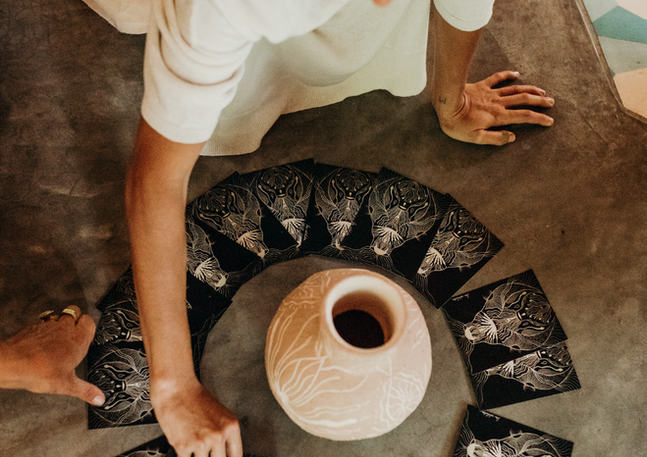 Poder seguir caminando con estas vasijas sin que pesemos tanto. Buscar la liviandad, la ligereza, para encontrar la fluidez en el viaje y en el vuelo. Quise convertir mi obra en este oráculo de, hasta ahora, treinta cartas. Una vasija viajera como amuleto, como centro de esos altares que quiero seguirle ofrendando a mi madre, a la muerte, a la vida y al arte. Después de las exhibiciones, viajamos a Todos Santos, Baja California Sur, México. Viajamos en esta nueva teniendo también esta versión. Allí escuchamos la voz de las piezas, quienes nos trajeron mensajes y nos inspiraron a pintar úteros y seguir haciendo del arte una herramienta para encuerpar mensajes y darles una mayor profundidad en nuestro ser.